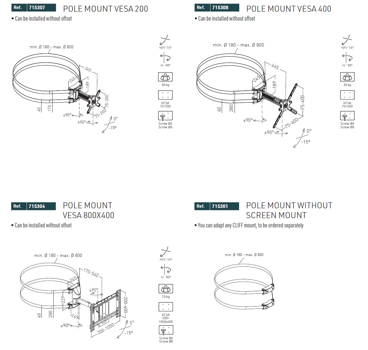 90° schwenkbar, 15° neigbar, für Säulen bis 800