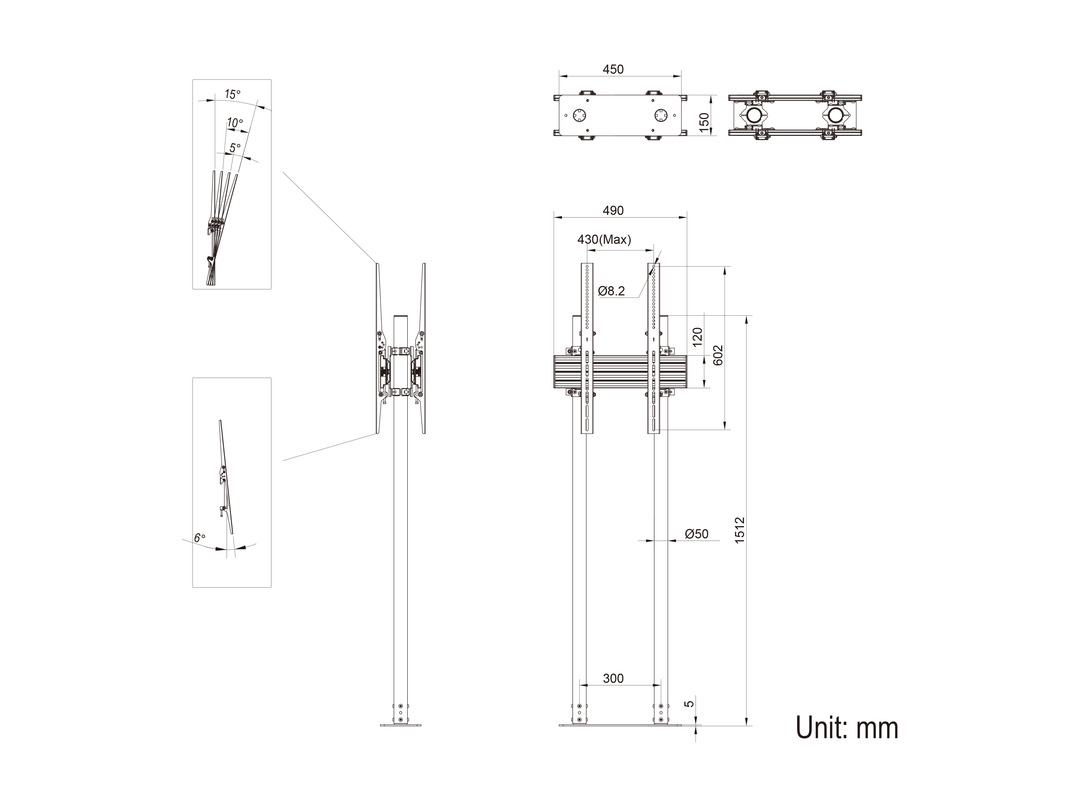 Back to back, neigbar von - 6° bis +15°, Micro-Höhenkorrektur bis 10mm, max. Höhe 1600mm,