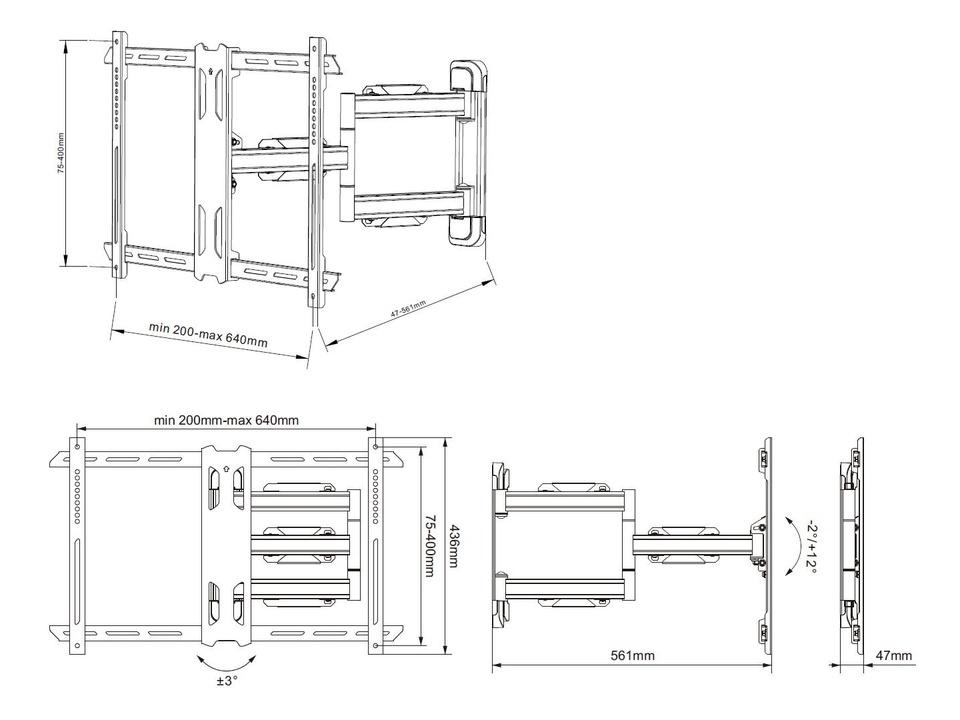 mit 3 Gelenken, Wandabstand 47-561mm, Kabel-