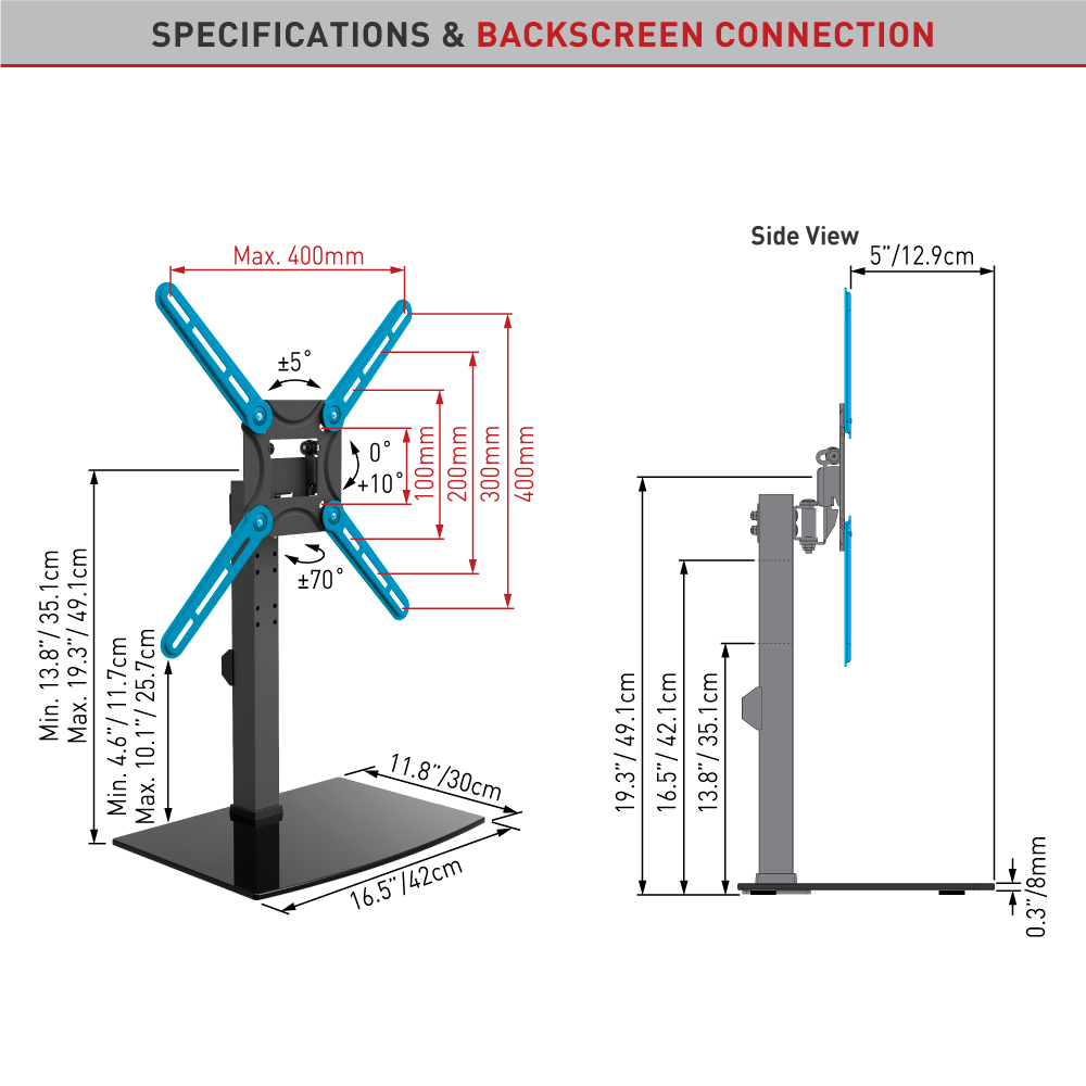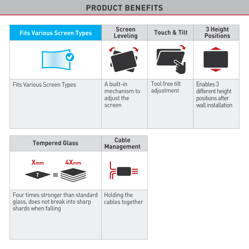 VESA100x100-400x400, max 25Kg. Glasplatte