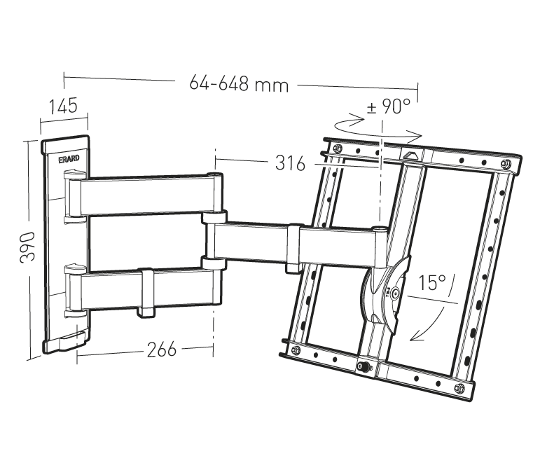 90° schwenkbar, 15° neigbar, Wandabstand